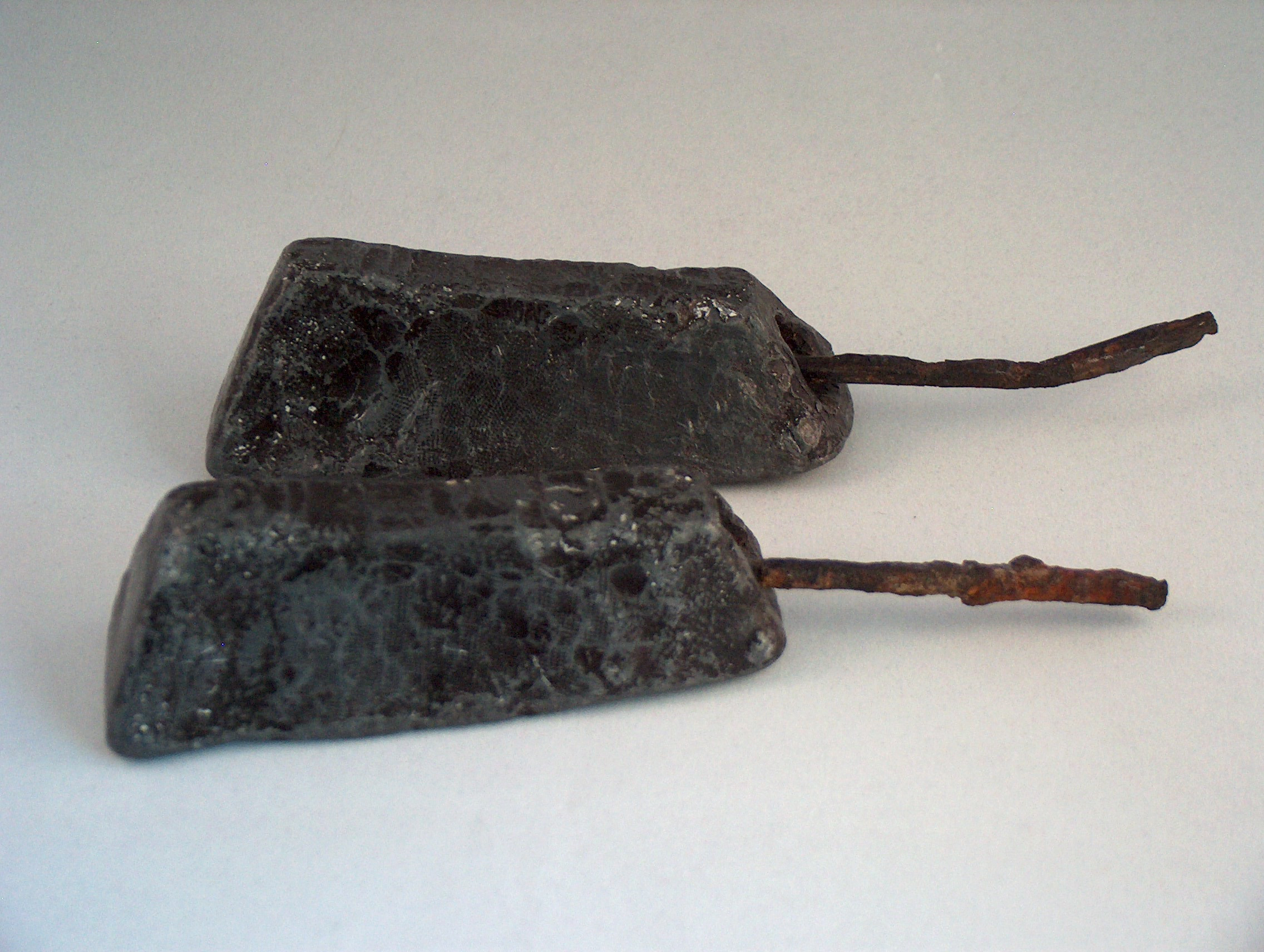 Beschrijving: Deze sloffen zijn opgegraven door de heer A.H. Balm te Zandvoort uit de voormalige gracht van het huis Groot Bentveld. In beide koppen zijn ijzeren pennen gegoten, die gebruikt zijn voor de verbinding tussen steel en kop.
