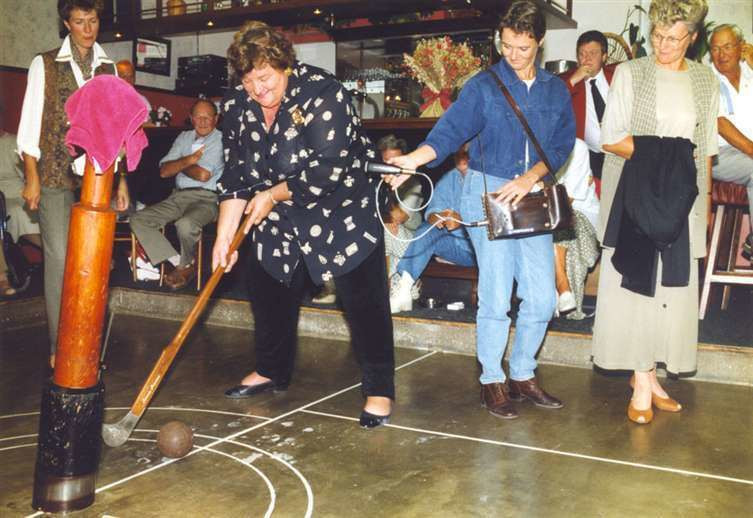 Erica Terpstra verricht de uitklap (volgens de aantekening bij de foto: perfect op maat...!) voor de opening van het Nederlands Kampioenschap in Oudkarspel in 1995. Achter de paal zien we Annette Klinkert, inmiddels oud-voorzitter van de Kolfbond. Naast Erica Terpstra een verslaggever van Radio Noord-Holland en rechts Jeanet Appel.