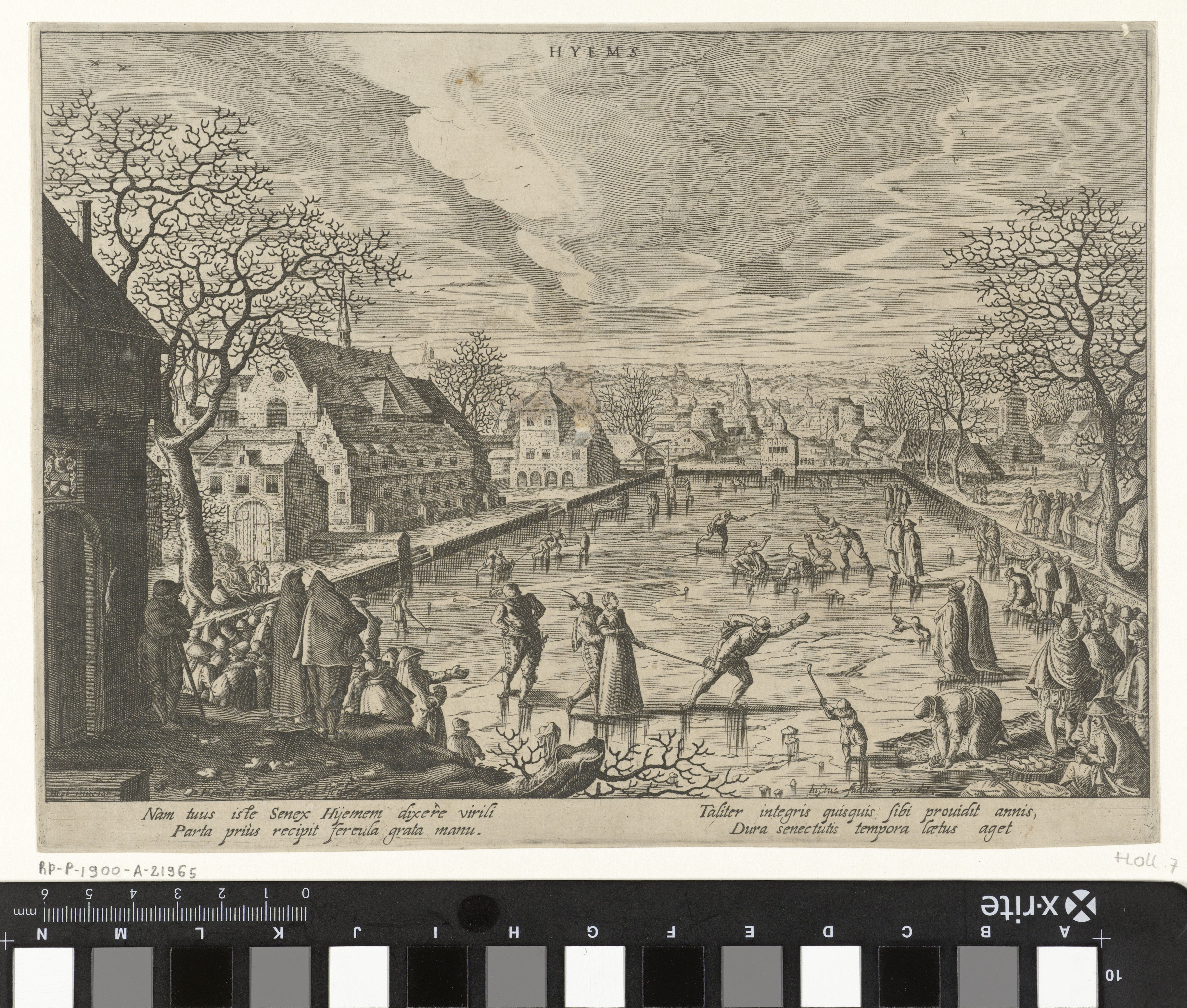 Hyems (= Winter), vroeg 17e eeuwse ets, in Rome vervaardigd door Hendrick van Schoel (prentmaker; ? - 1622) naar een tekening van Hans Bol (vermeld op object; 1534 - 1593) en uitgegeven door Justus Sadeler (vermeld op object; 1583 - ?) met de afbeelding van een bevroren kanaal.