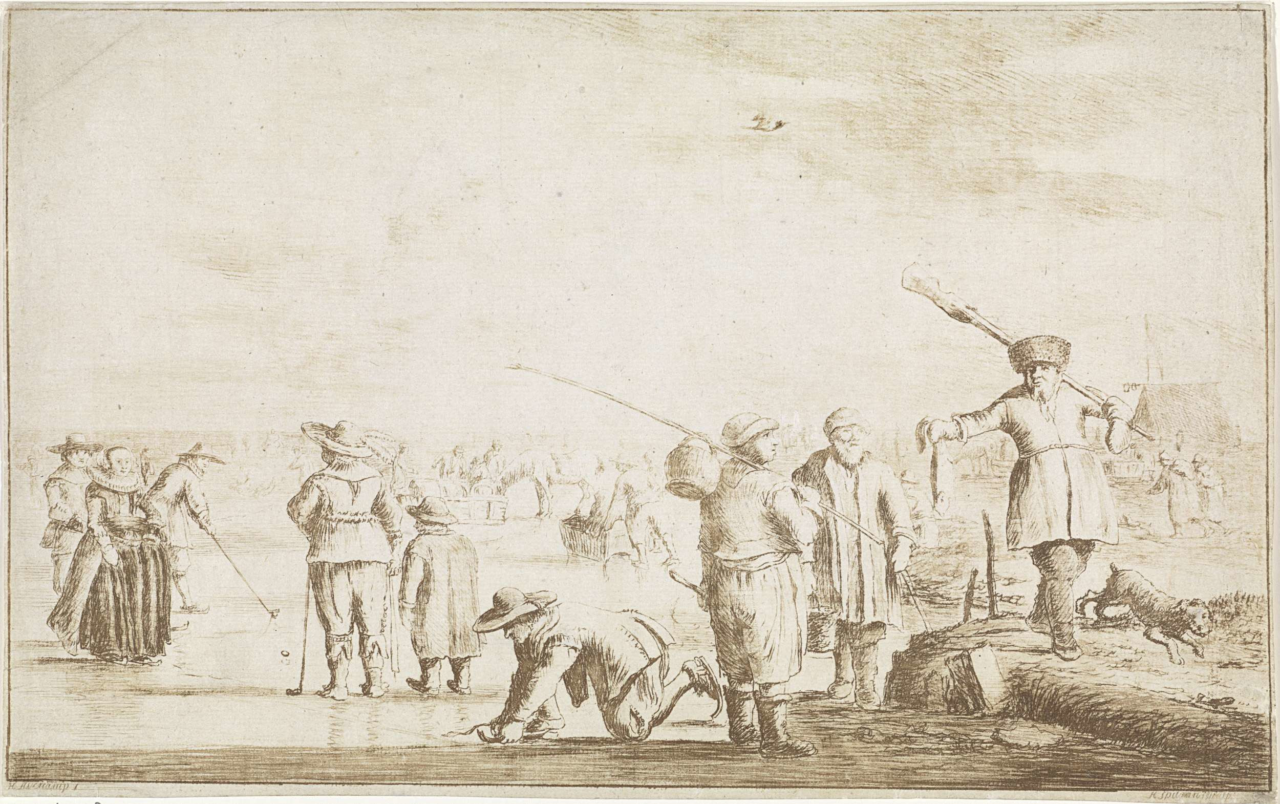 IJsgezicht met jager die een otter toont, door prentmaker Hendrik Spilman (vermeld op object; 1721 - 1784) naar een tekening van Hendrick Avercamp (vermeld op object; 1585 - 1634). Op het ijs schaatsers en colfspelers.