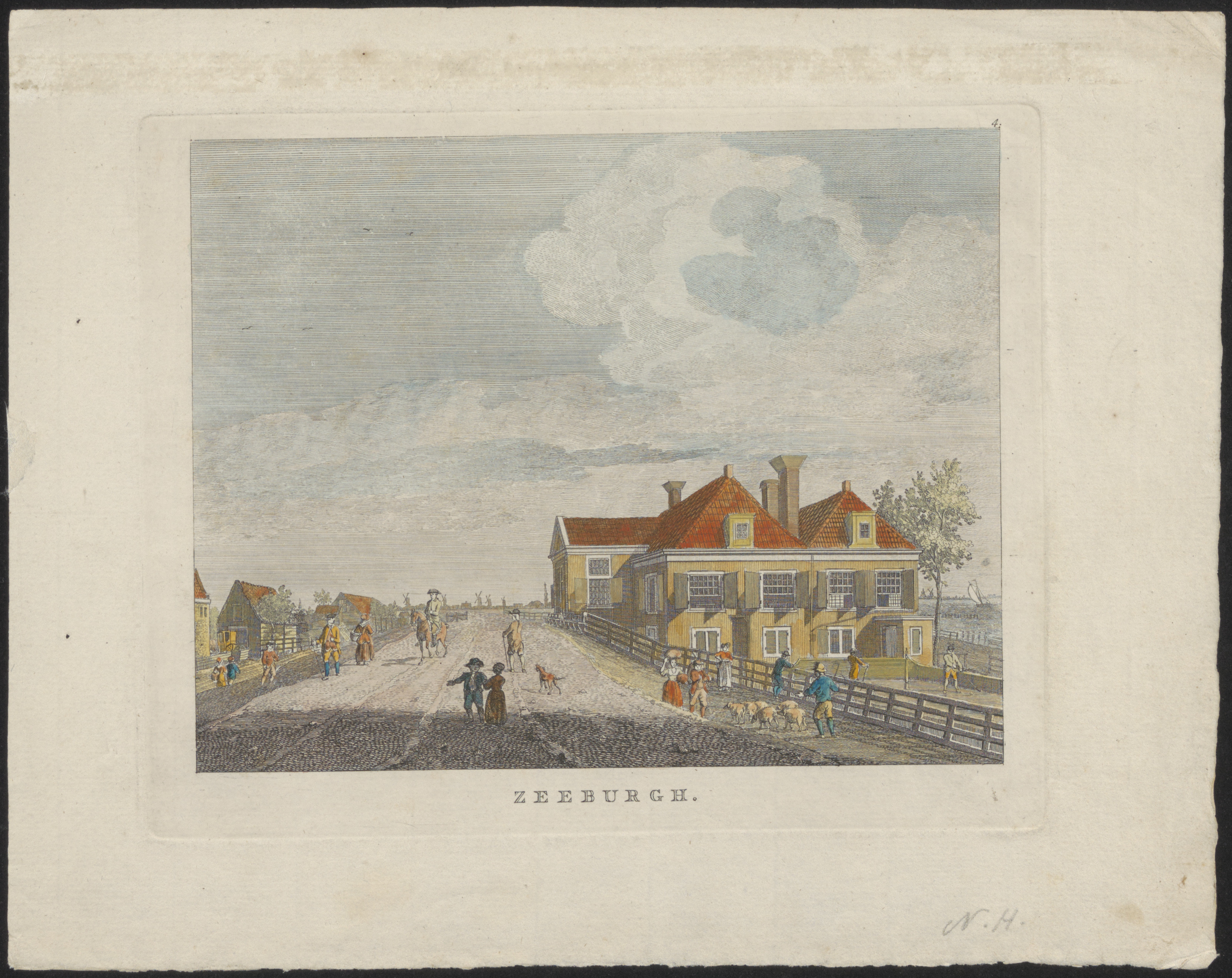 Kolfbaan (rechtsonder) bij de herberg Zeeburgh met het huidige adres Zeeburgerdijk 633 te Amsterdam. De ets is tussen 1770 en 1780 vervaardigd door H.P. (Herman) Schouten (1747-1822), etser en tekenaar te Amsterdam. We kijken hier in westelijke richting.
