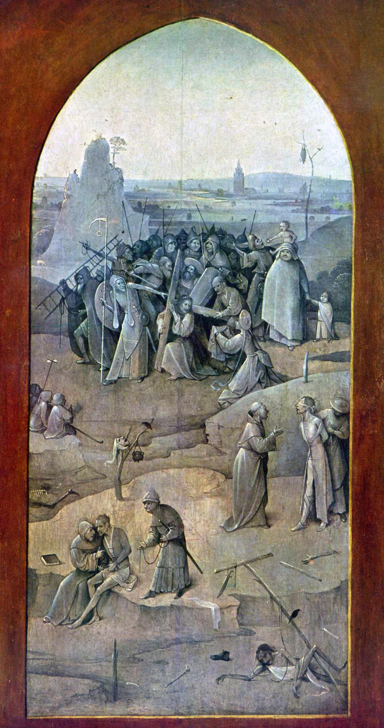 Also the rears of the side panels are decorated with presentations. These rear presentations are done often in girsaille, different shades of grey. On the rear of the right side panel Christ is depicted carrying the cross. At the extreme left of the panel three boys are visible. One of them is holding a colf club.