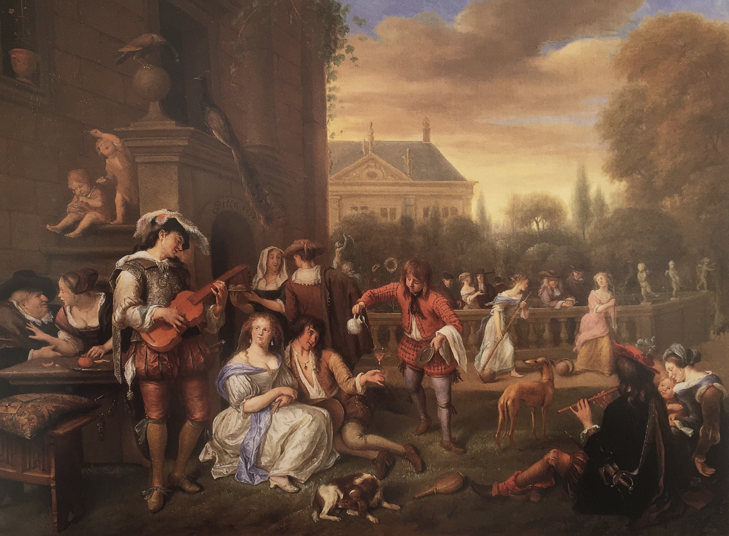 Beugelen tijdens een tuinfeest bij de familie Paets. Op dit schilderij zijn beugelende dames afgebeeld en dit zien we niet vaak op 17e-eeuwse schilderijen. Robin Bargmann: 'Het tafereel van Jan Steen zit natuurlijk vol met zinnebeelden de liefde betreffende. Het beugelspelen is volgens mij ook een verwijzing naar het ondeugende (dat iets niet door de beugel kan).'