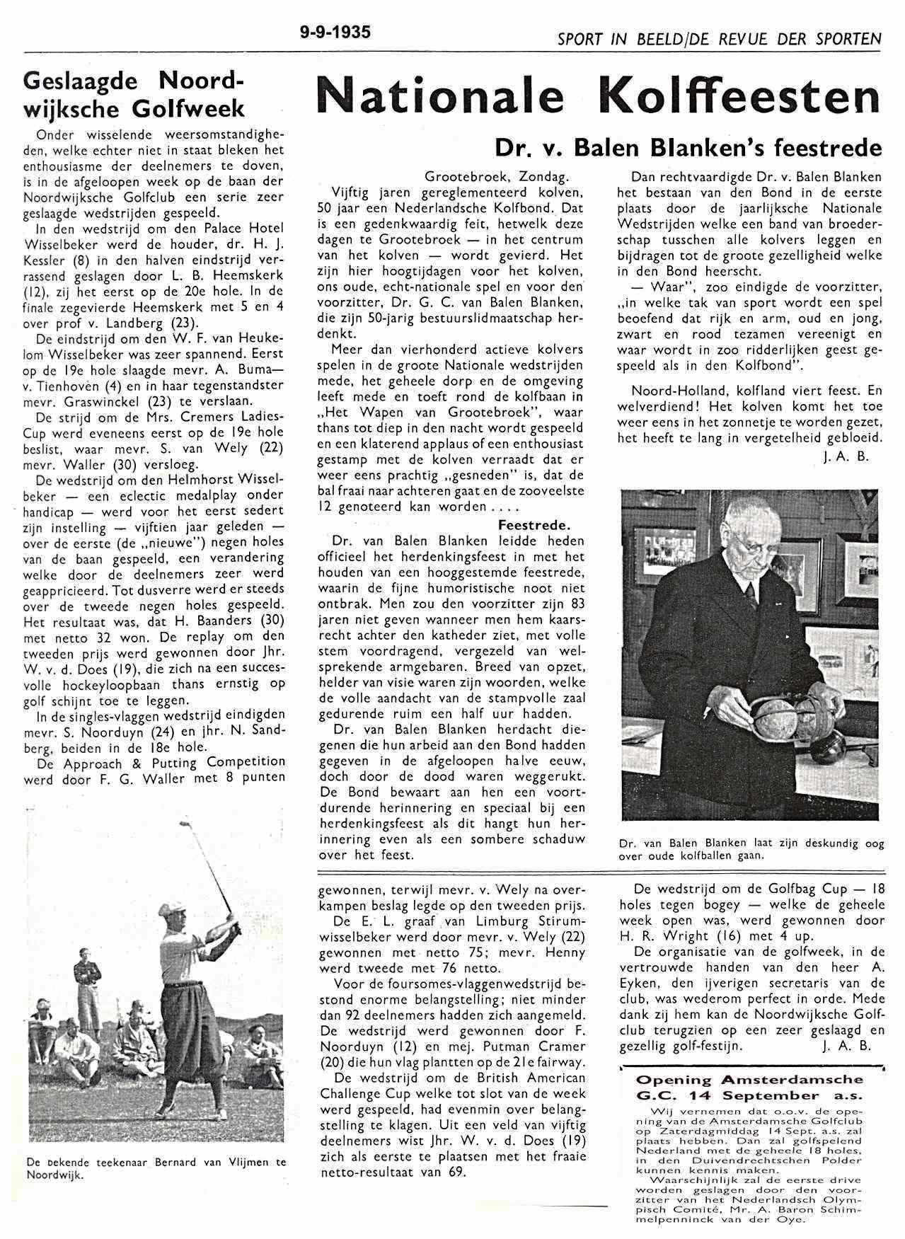 Dr Van Balen Blanken's feestrede in: Sport in beel/Revue der Sporten d.d. 9 september 1935