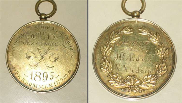 Medaille, uitgereikt aan J.G. van Eden uit Nieuwe-Niedorp als 1e prijs tijdens de landelijke kolfwedstrijd in 1895, georganiseerd door Sociëteit 'Ons Genoegen' te Krommenie. De heer Van Eden werd Nederlands Kampioen in 1897 en 1900.