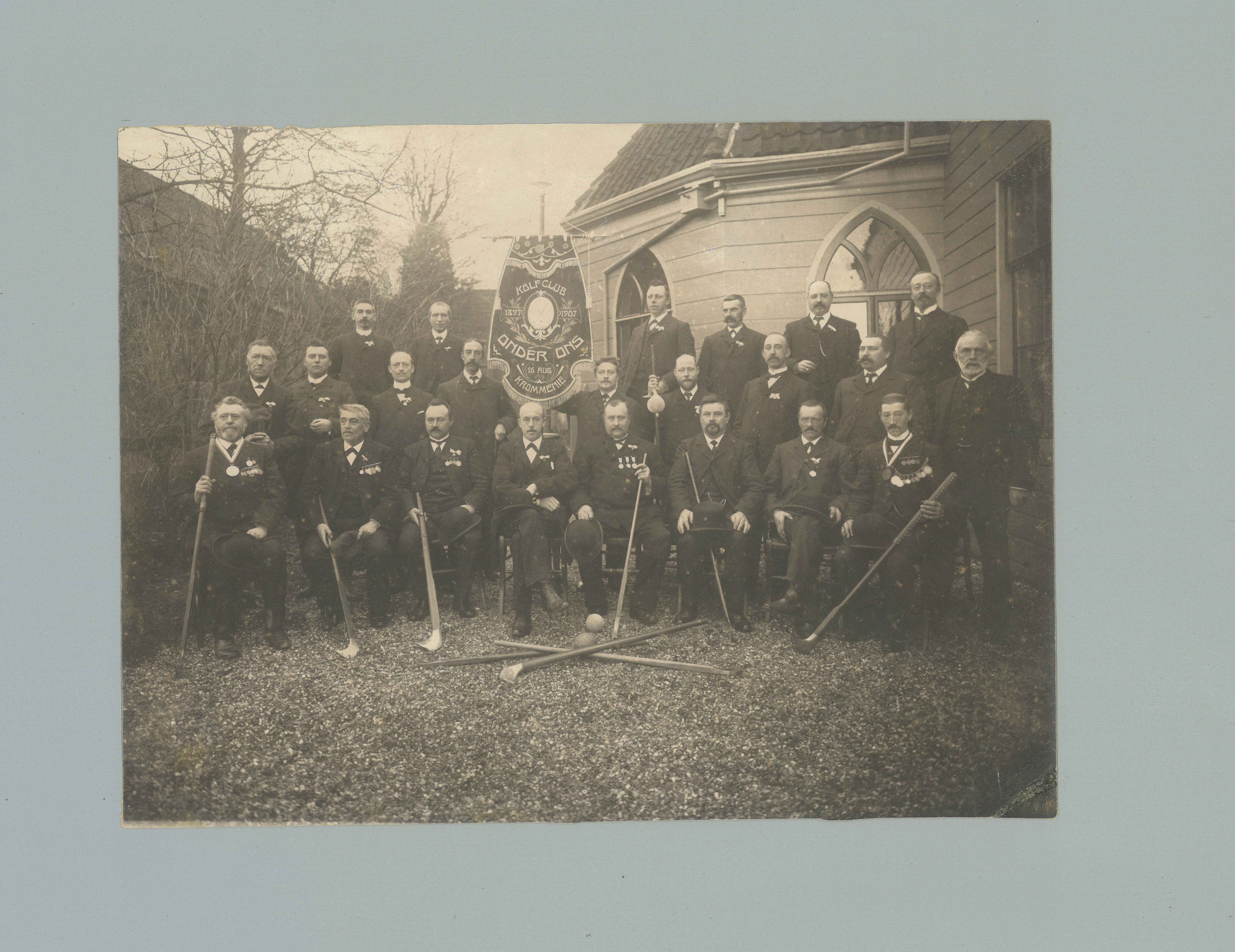 Foto uit 1907 van kolfclub 'Onder Ons' uit Krommenie. Deze kolfclub organiseerde in dit jaar de Nederlandse kampioenschappen (waar de Utrechters de korpsprijs wonnen) en zijn tijdens deze dagen vereeuwigd. De opname is gemaakt achter de societeit 'Ons Genoegen'.