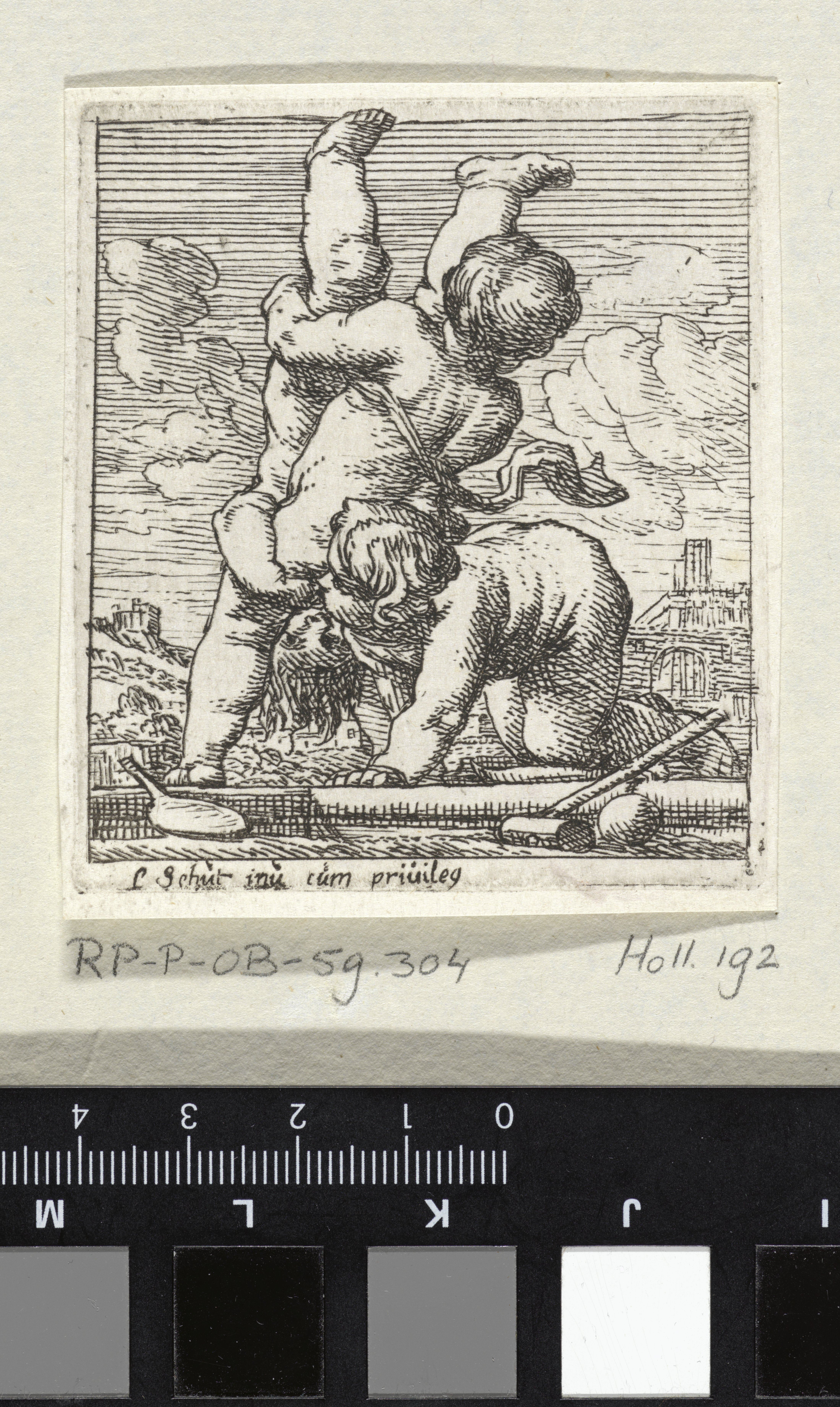 Drie worstelende putti, vervaardigd door Cornelis Schut I (vermeld op object; Antwerpen 1597 - Antwerpen 1655) naar eigen ontwerp (vermeld op object). De verlener van privilege is onbekend (vermeld op object).