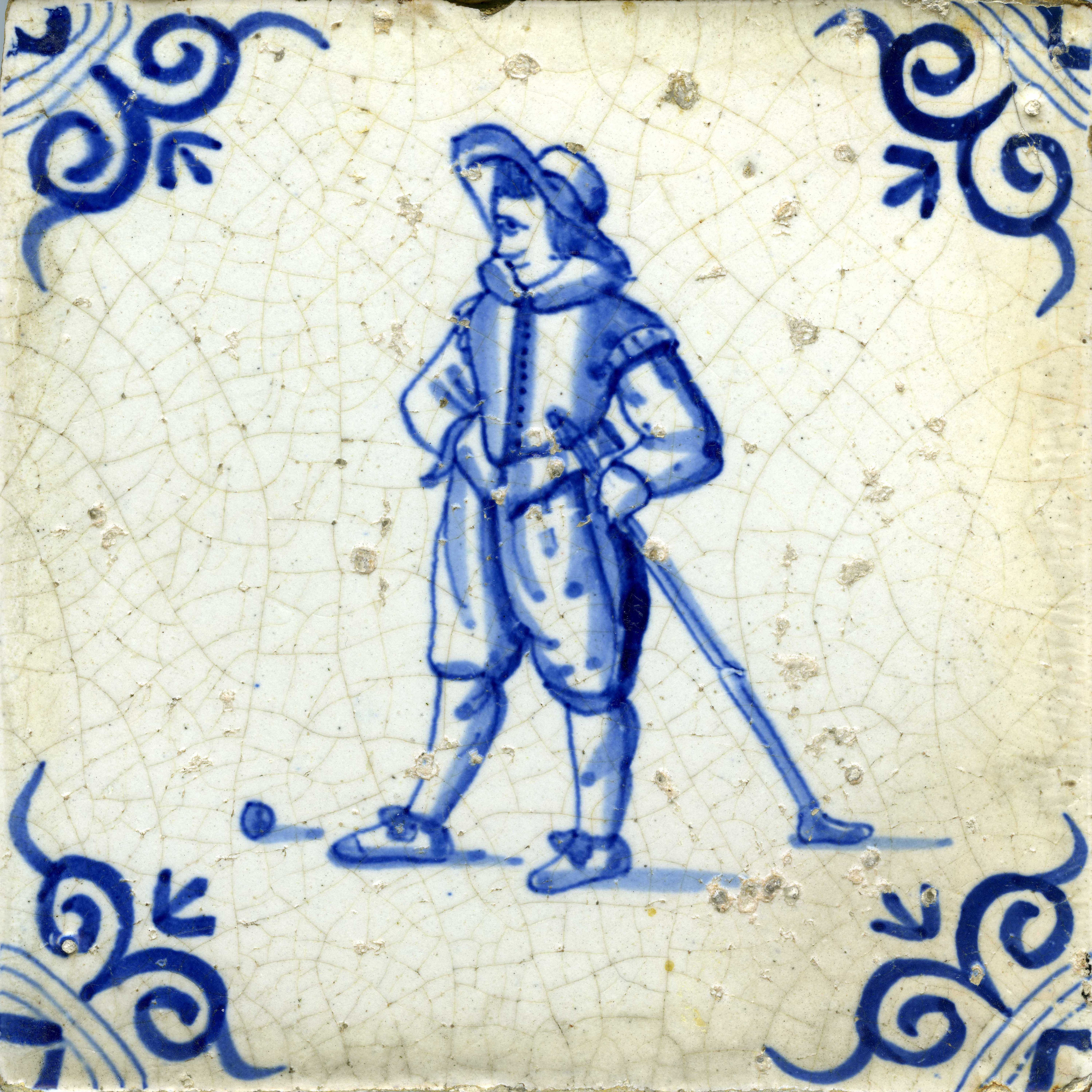 Tegel met grote ossekop als hoekmotief. De figuur is fors getekend, maar eenvoudig gekleed. De bal is zichtbaar. De figuur is nagenoeg gelijk aan de figuur op de vorige tegel (er zijn enkele verschillen).